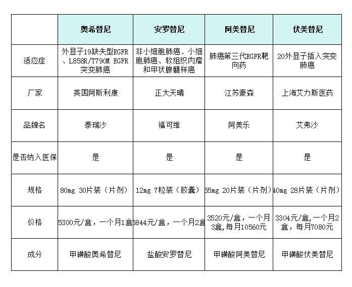 安罗替尼、阿美替尼、伏美替尼、贝福替尼、奥希替尼(Osimertinib)对比